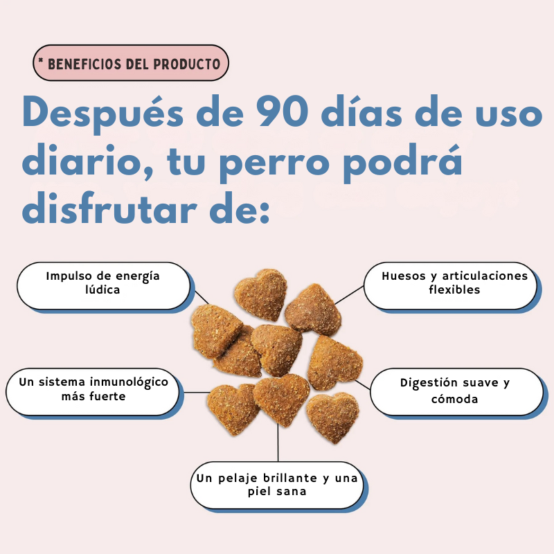 Los beneficios que la mayoría de los perros experimentan (menor picazón, mayor actividad, mejor humor) son solo ventajas adicionales para mejorar su salud a largo plazo. Si se toma de forma regular a diario, la mayoría de los perros empezarán a notar efectos positivos en unas 6-8 semanas.